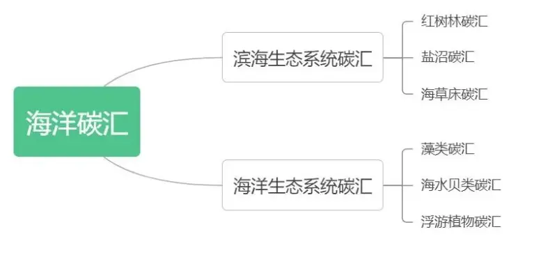 海洋碳汇,是指海洋活动及海洋生物吸收大气中的二氧化碳,并将其固定、储存在海洋生态系统中的过程、活动和机制。相对于陆地森林固定的林业碳汇——“绿碳”而言,海洋碳汇被称为“蓝碳”,且又可进一步分类为“滨海”以及“海洋”两类生态系统碳汇。
