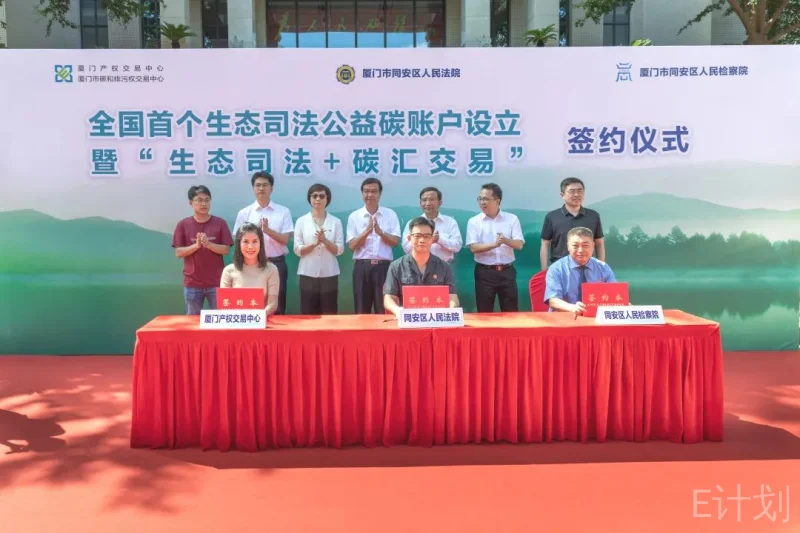 2022年8月30日,全国首个生态司法公益碳账户设立暨“生态司法+碳汇交易”签约仪式在厦门举行。厦门市同安区人民法院、厦门市同安区人民检察院与厦门产权交易中心(厦门市碳和排污权交易中心)开展合作,依托厦门产权交易中心设立的全国首个农业碳汇交易平台和全国首个海洋碳汇交易平台,打造生态司法和碳汇交易平台之间的直通机制,建立“蓝碳+绿碳”的“双碳”生态司法修复模式。