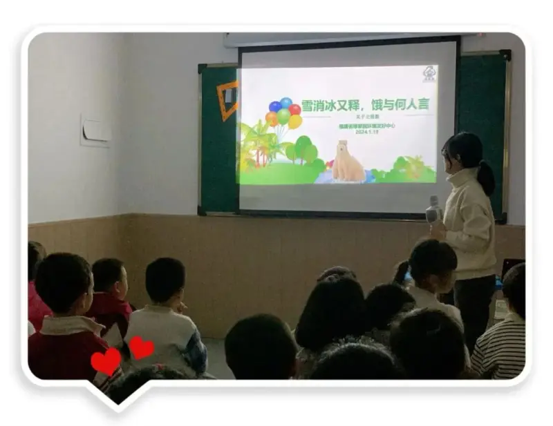 2024年1月18日、19日、22日,福建省绿家园环境友好中心的副总干事鲁贝贝为叮铛晓学堂3个校区的100名小学生围绕“全球变暖”主题开展教学,带领小朋友认识与体验北极熊的生存困境,激发孩子们对北极熊的怜悯之心和保护之情,并由此引出北极熊陷入生存危机的原因——全球变暖。