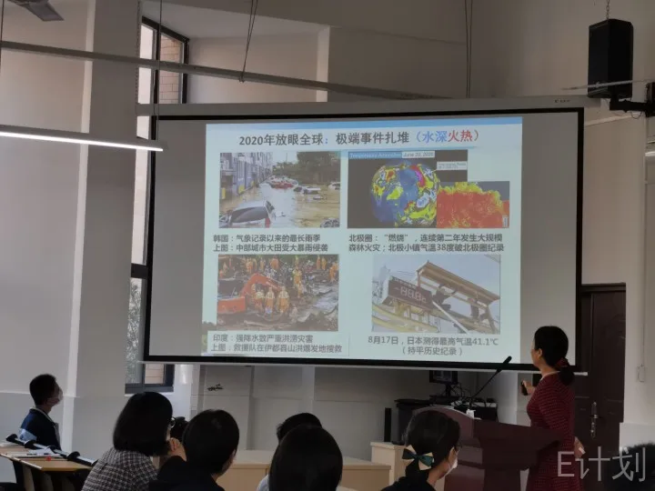 前半阶段,邹燕博士以频发的极端气候为切入点,通过展示各类图片、各项数据,深入浅出地为同学们介绍了全球严峻的气候变化形势和中国为保护环境做出的努力,尤其强调了福建省结合本地特色气候资源潜力所开展的生态文明建设气象保障系列工作。同学们个个聚精会神地听讲。