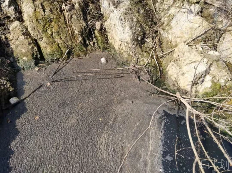 猪场的排水口水质清澈,水量大且流速快,排出的水汇入山泉后形成小溪流出山谷。然而,沿溪而下,水体流速变慢,岸边有沉积的猪粪,水发黑发臭,泛起大片黑色泡沫,像大象粗糙的皮肤褶皱。